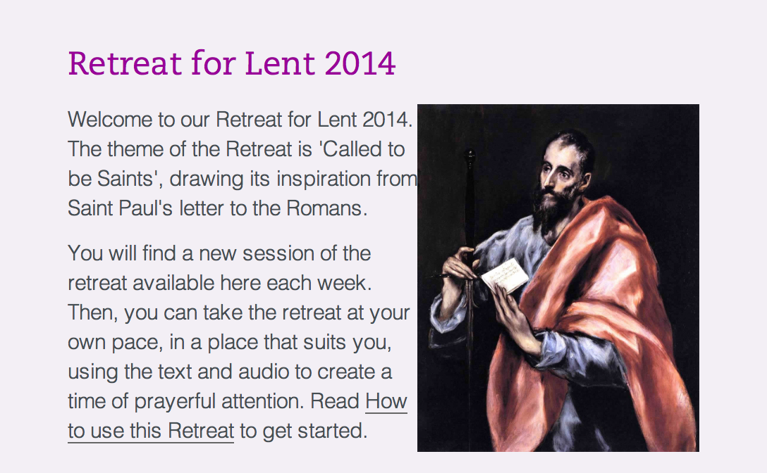 Irish Jesuits’ Sacred Space Retreat for Lent 2014 at http://retreats.sacredspace.ie