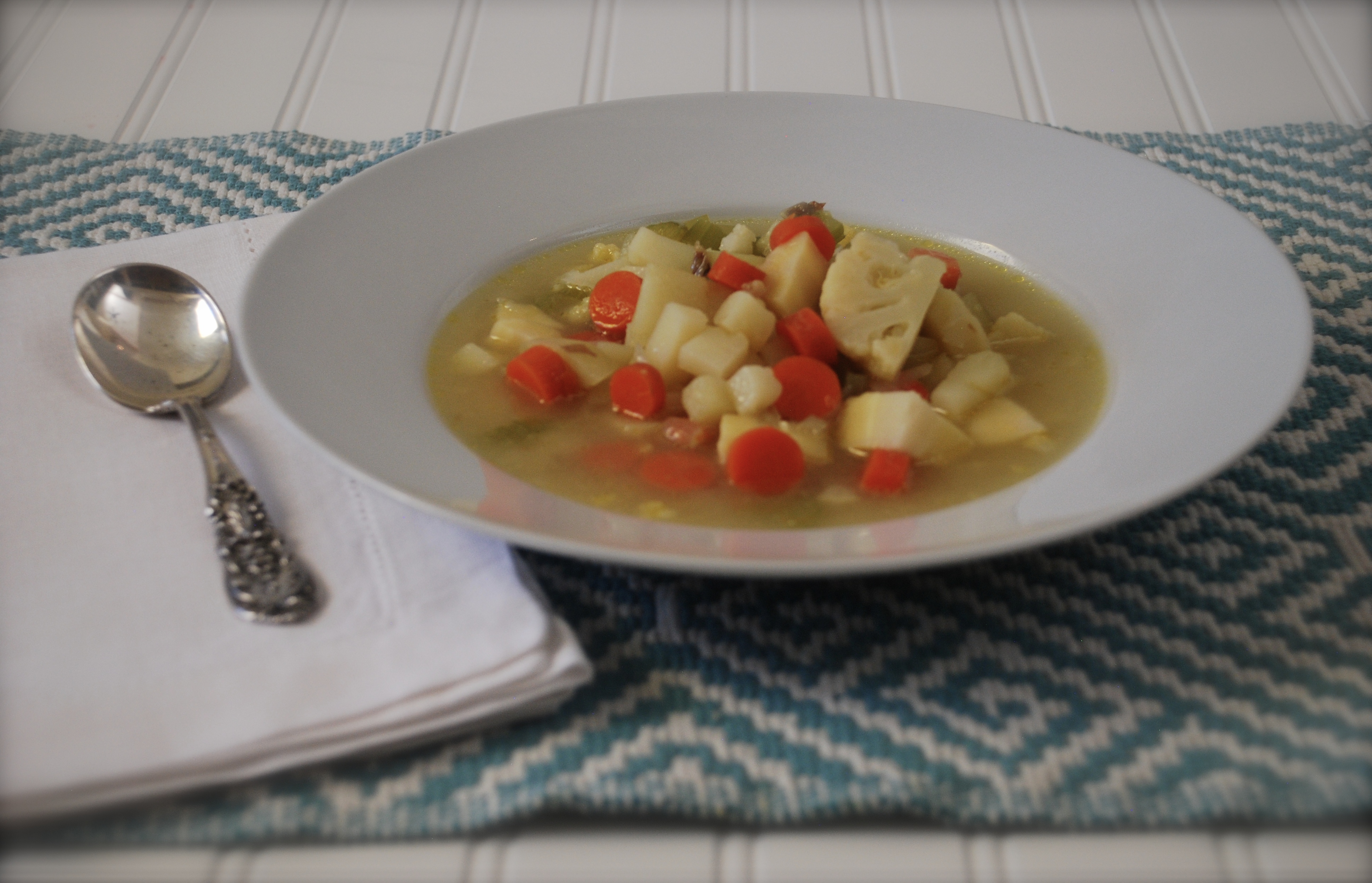 4. Add the stock, carrots, parsnip, celery, and cauliflower, lower the heat and simmer for about 20 minutes or until the vegetables are tender when you insert a fork.