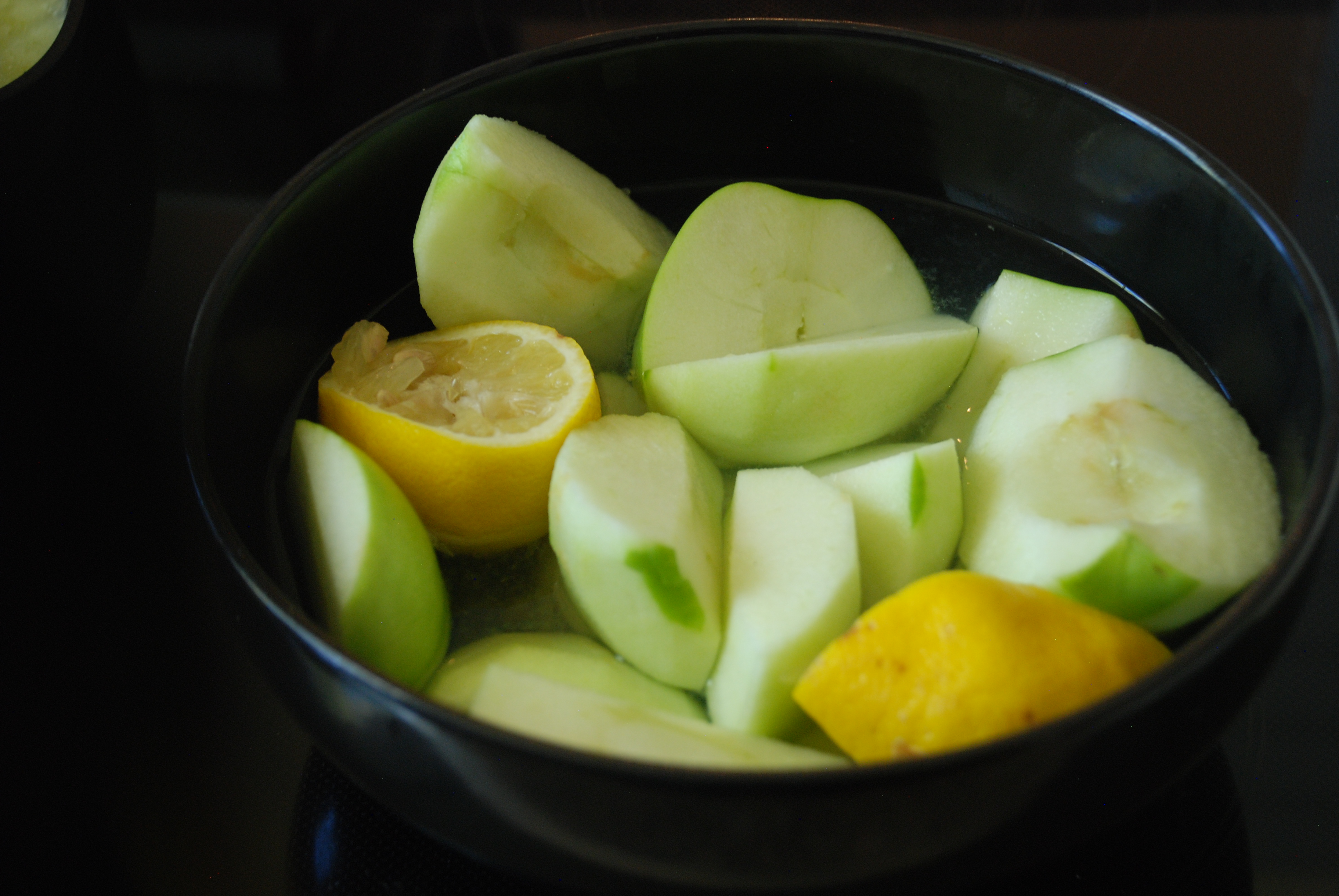 2. Place apples (peeled, cored and cut) into a medium size bowl. Cover with water and squeeze the juice of the lemon into the water. Put the lemon halves into the water as well.