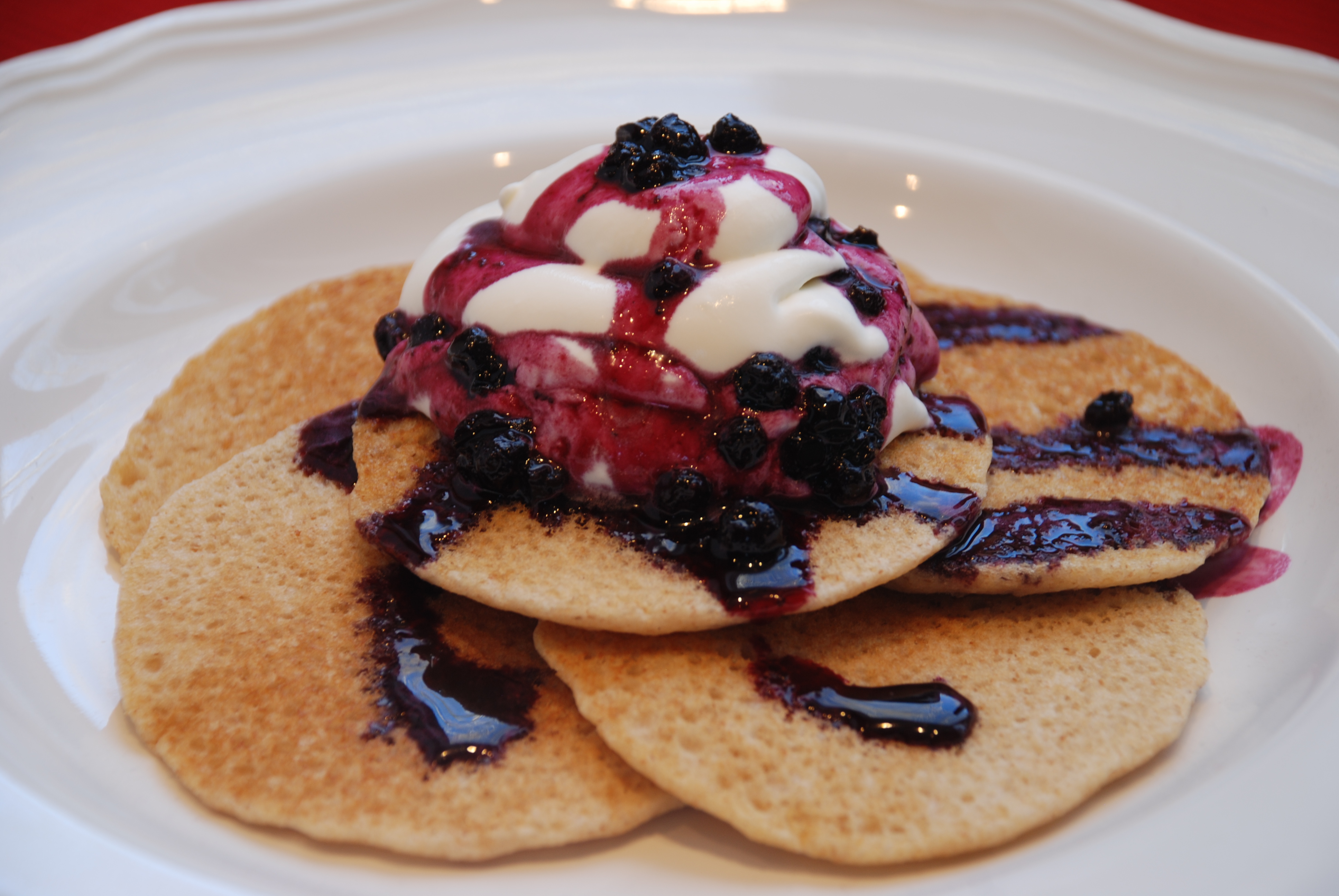 The pancake recipe comes from America’s Test Kitchen and the Blueberry Compote recipe comes from Ellie Krieger at the Food Network.